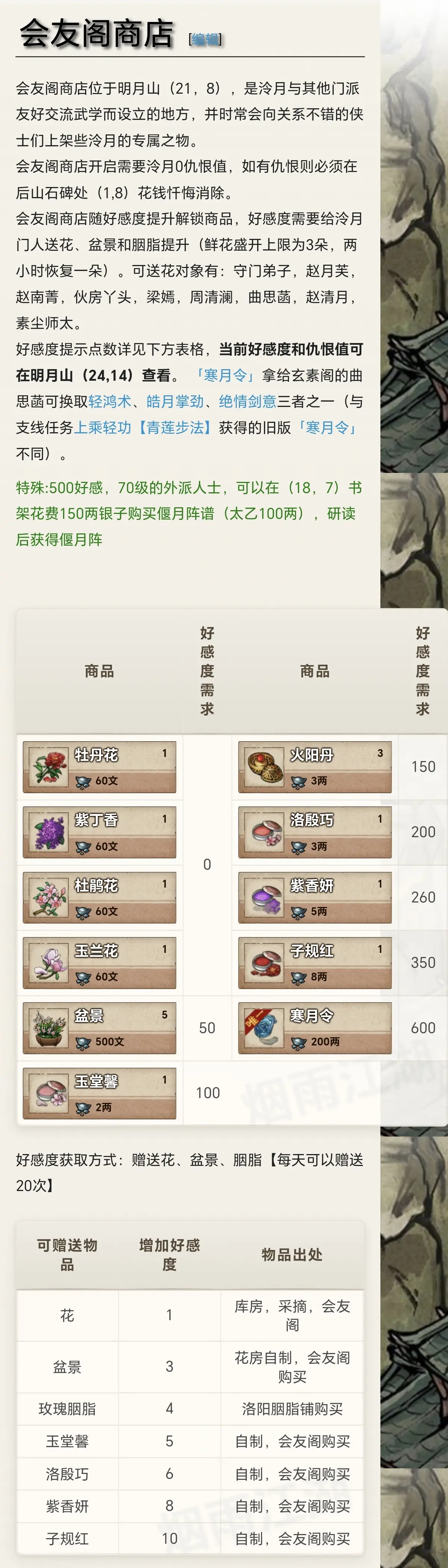 泠月有会友商店玩法(通过每日送花或盆栽获取资源,女主可提前购买火阳丹,入门派后一颗1000贡献,非常黑,男主可凑500好感后期购买阵法,若用奶指打风林火山,该阵法最佳)