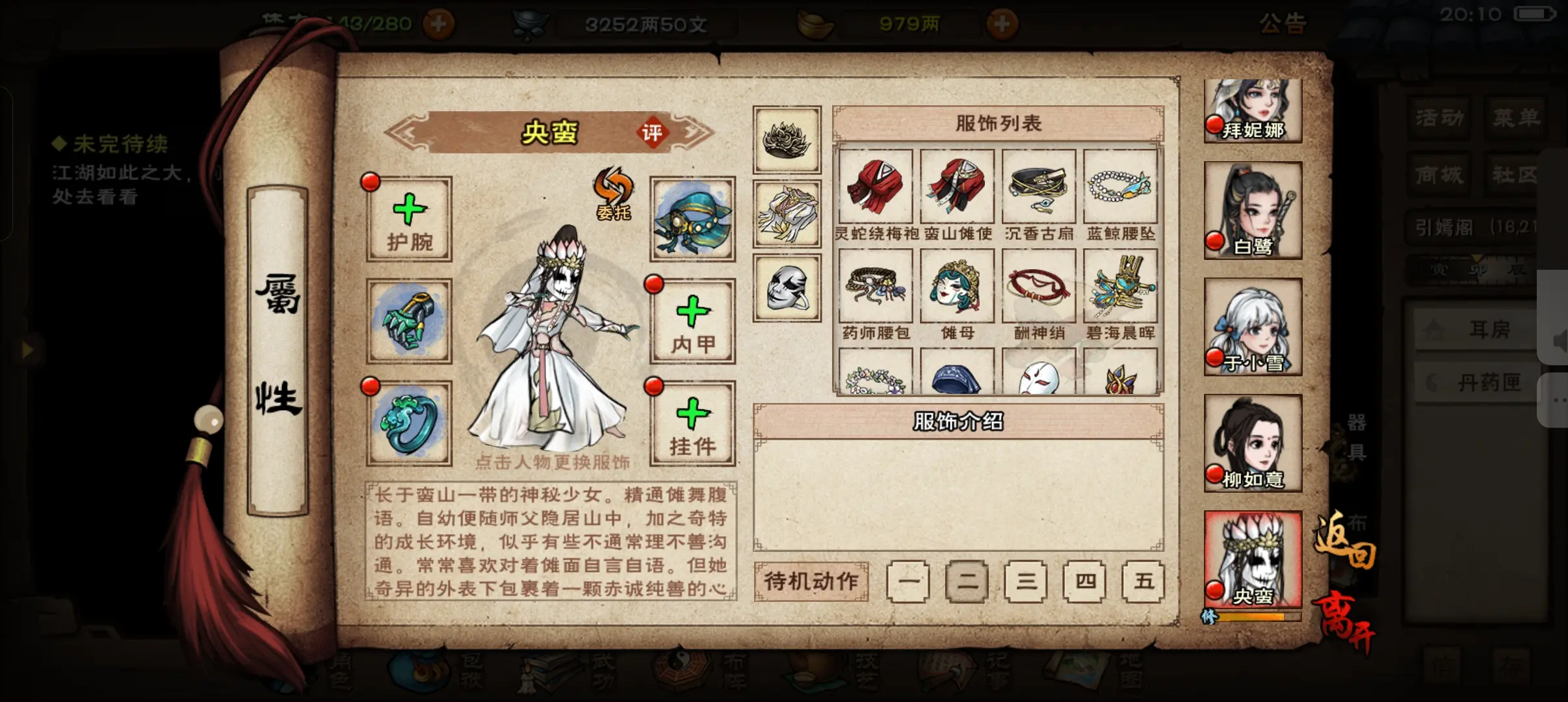 常驻商城随从,可于商城2800元宝购买,主线支线无剧情,拥有独特的蛊术机制,可释放三种不同效果的蛊,一般用来当主t,但身板较脆,较为特殊,数值垫底,功能型选手,深度依赖氪金才能得到的凌波微步,放在大佬或氪佬手里能发挥出跻身第一梯队的作用,但放在平民或新手手里则效果不佳。九幽有奇效。非真爱不建议购买培养。