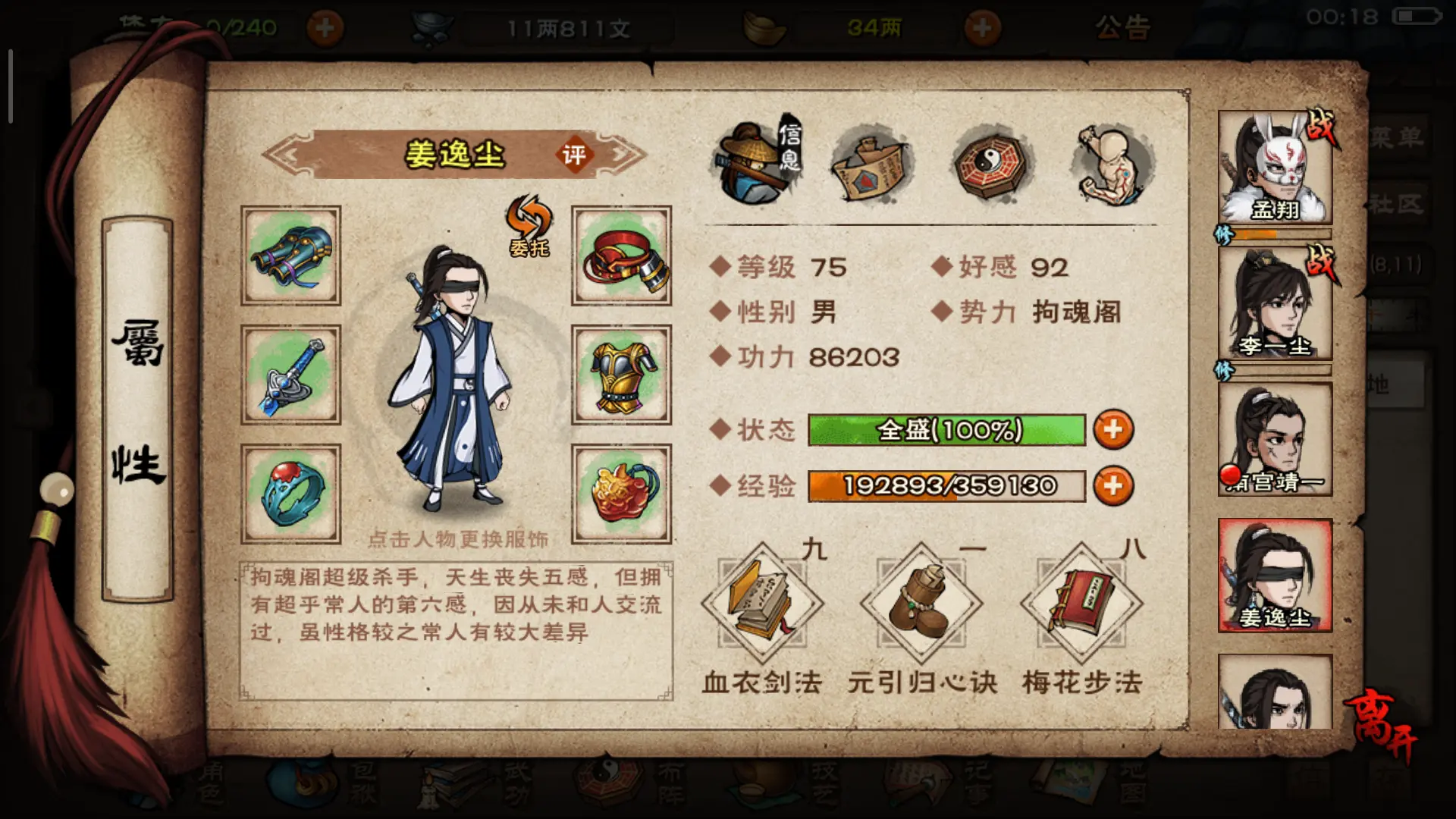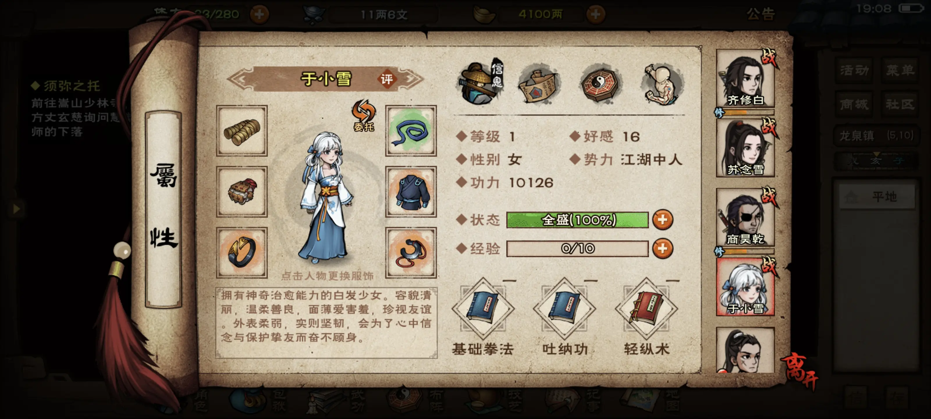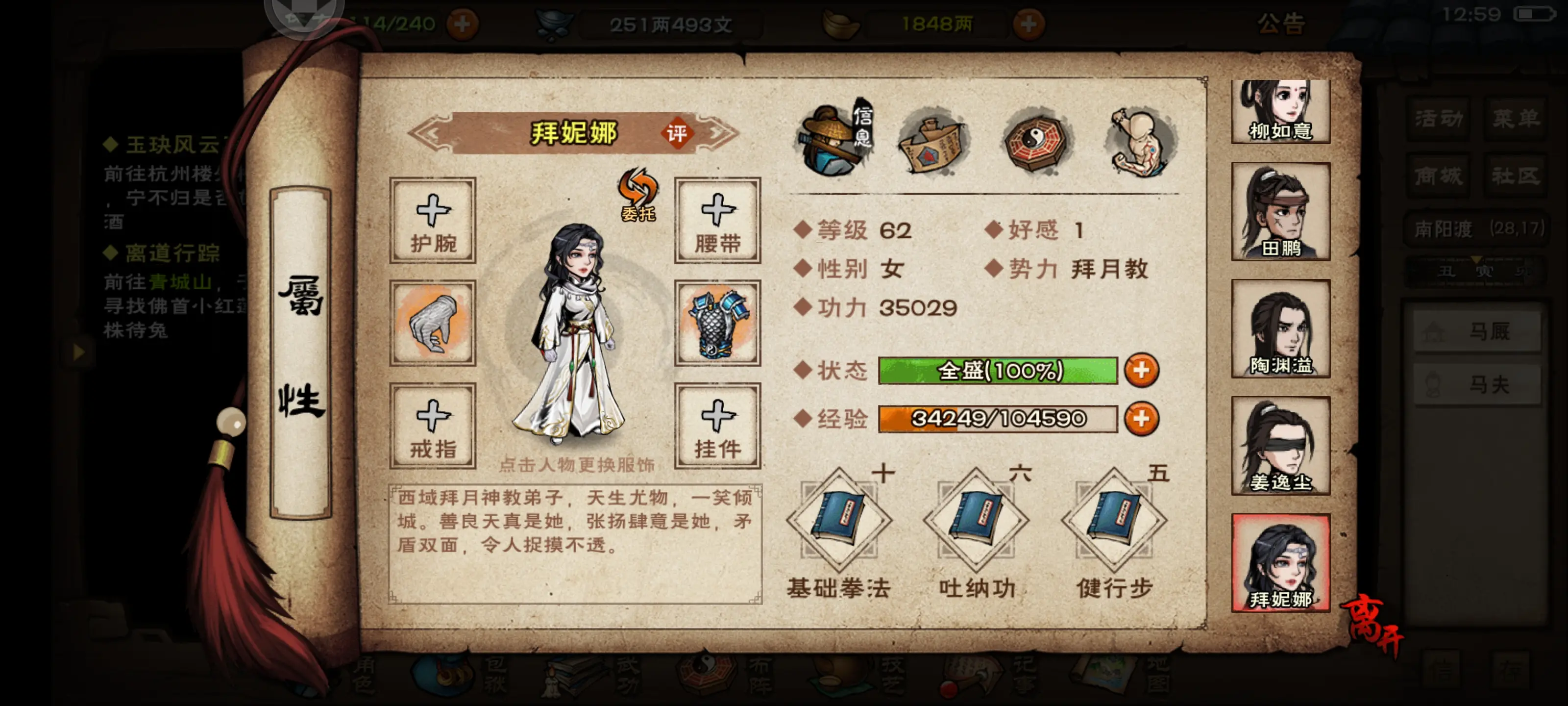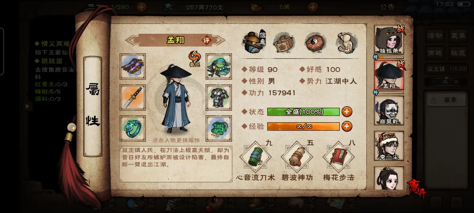 常驻随从,于洛阳古玩店购买佛珠(3000元宝)通过任务获取,根据自身等级以及好感升级天赋和寄刀决,萌新开荒的有二之选(另一个是步惊云),越早拿到越好,70级左右能获得镇派以及给一个熊掌开启青城山蜂蜜商店的含金量,但天赋绑定寄刀,并且寄刀自带减防使得身板较脆不适合PVP,好在寄刀可以给老商,桃花等,也算是精神永在了,但百级精进较弱,后期不如用伏羲。