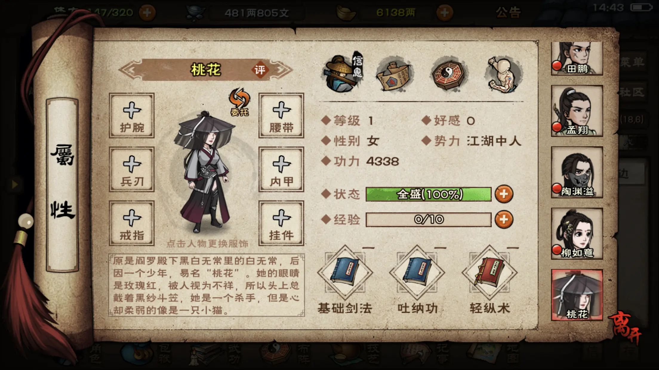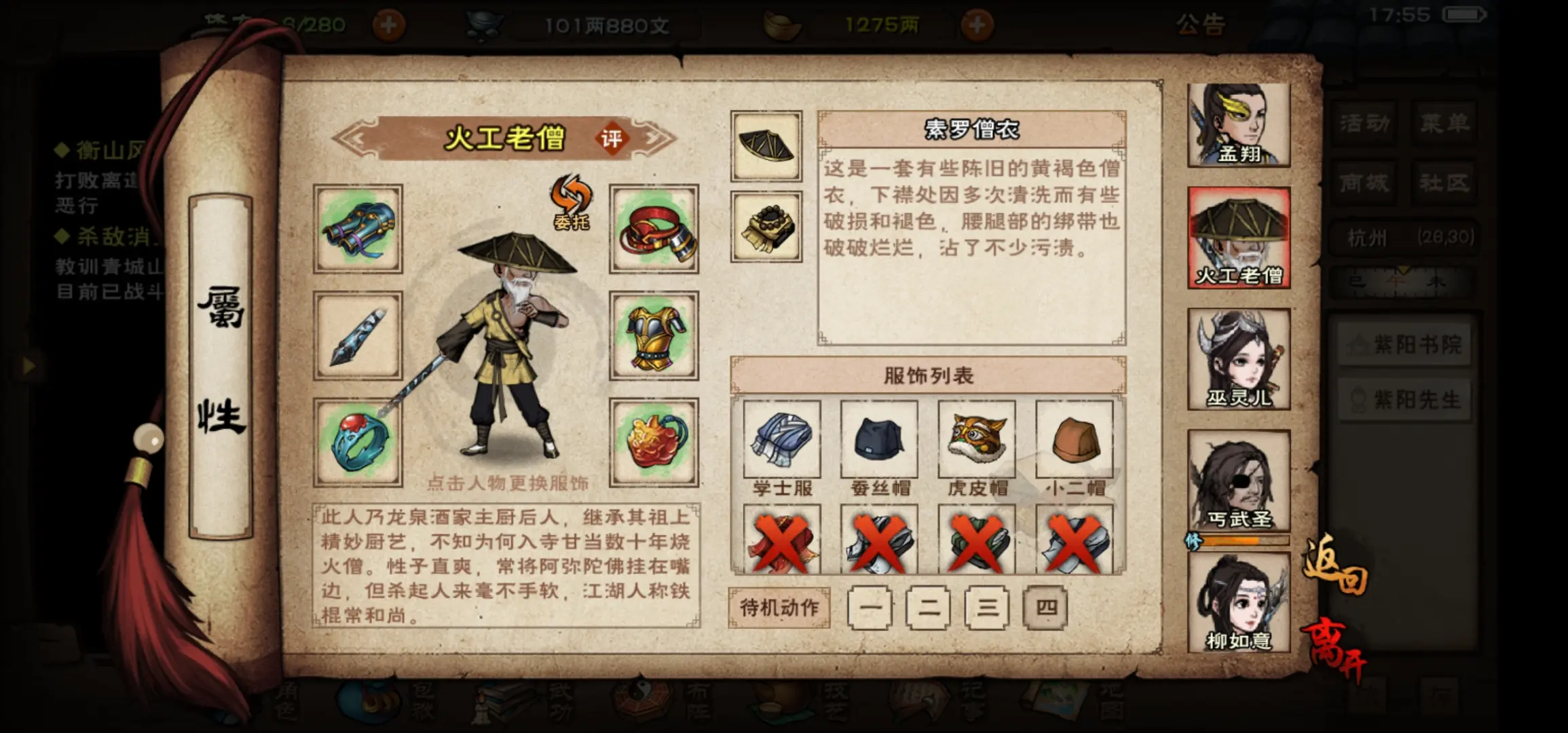 顶级免费随从,开局可获取,但有一定获取难度和天赋升级难度,一开始可以在天刀门口的小房子里找到他,然后教他武功,单一武功达到24可以在泉州遇到后续,三级天赋需要击败一次燕王府才能进行。免费随从中独一档的存在,易获取,功能性强,天赋也是不错的,早期没有天赋升级时穿江紫衣的衣服和江紫衣一模一样,但天赋升级以后获取了面具和多了一道疤,是个苦命人,肉度较高,站在前排足够硬, 属于偏科性选手,是只能前排的随从,平民可培养,月卡基金党可过渡。