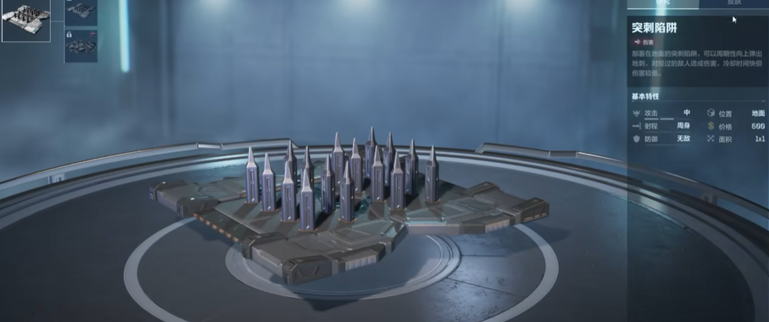 ‘突刺陷阱属于伤害类型陷阱,陷阱部署带地面以后,会周期性的向上弹出地刺,对于经过陷阱的敌人,陷阱上弹出的地刺能够造成一定的伤害,陷阱的冷却时间也非常的快,不过大家使用突刺陷阱的时候要注意,该陷阱造成的伤害非常的低,效果可能不如控制类的陷阱效果好。