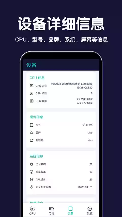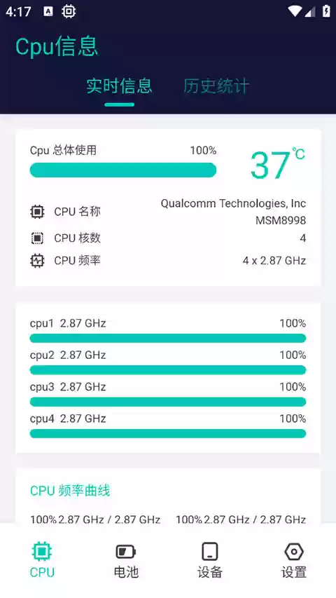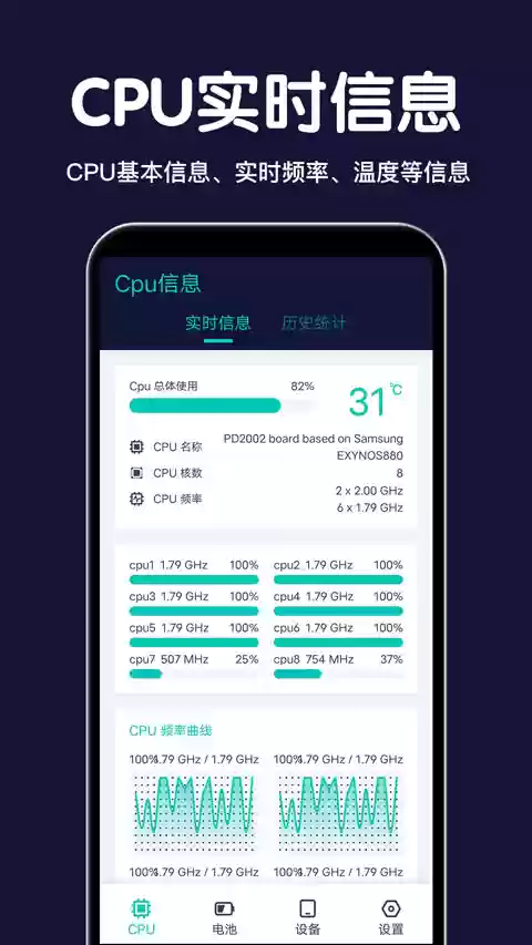 多多CPU设备信息app是一款实用的设备信息管理工具,能够让你了解手机的运行情况,比如CPU的使用率、温度、频率、电池能耗等等,这样,你就可以更好地掌握手机的性能状况,电池使用寿命,及时发现问题,进行调整或优化,让手机运行更加流畅。