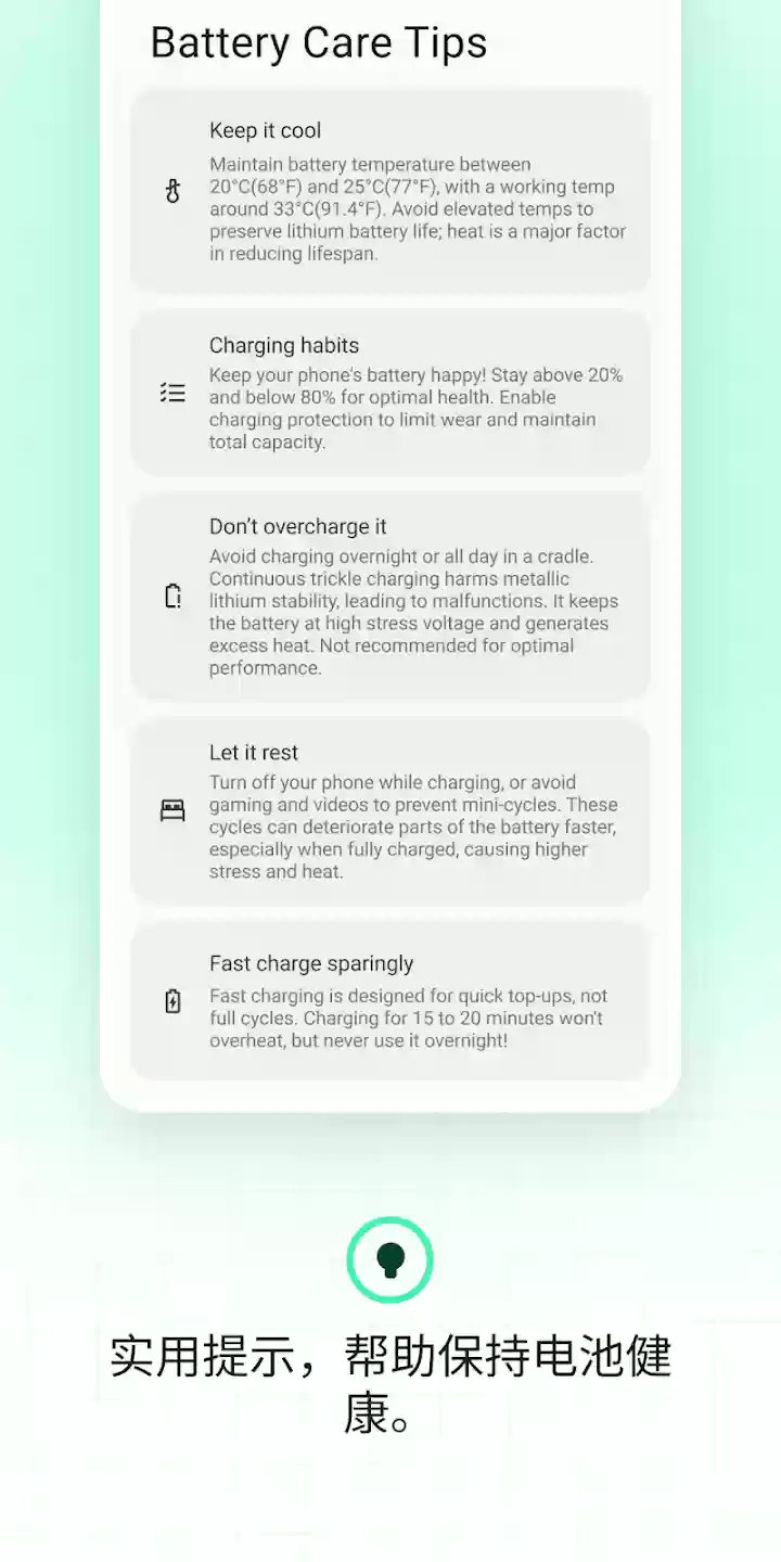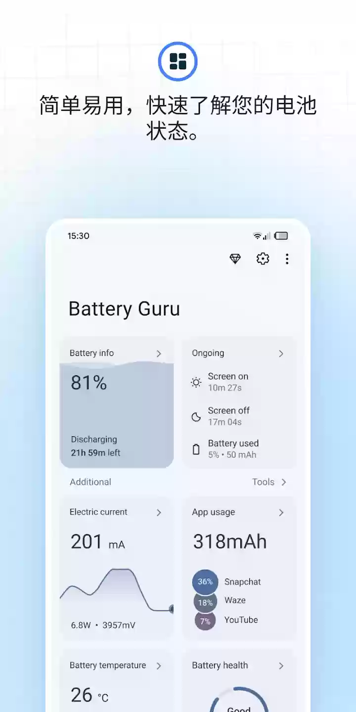 BatteryGuru是专为电池健康管理而生的软件,有了它就可以清楚的了解到手机电池的详细信息,比如电池寿命、电池使用情况、充电功率等等,同时可以提供智能优化模式,根据用户的使用习惯和当前的电池状态,自动调整手机的设置和功能,延长电池寿命和使用时间。