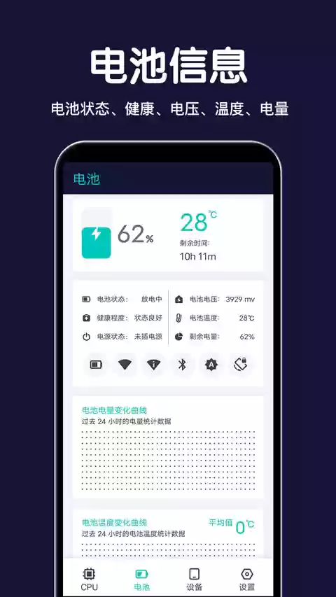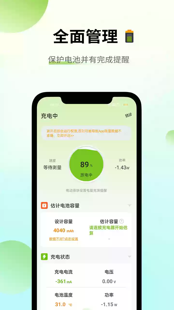 电池容量检测管理app是一款为您电池健康护航的智能工具,能够实时追踪电池的充放电次数、使用时间和容量,为您提供详尽的电池使用报告,并且还能根据您的使用习惯和设备性能,自动调节后台应用功耗,减少不必要的电力消耗从而提升设备的使用续航。