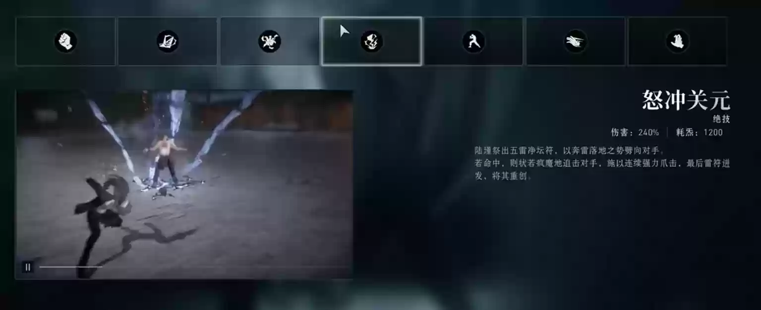 三技能双龙探爪是投技,100%伤害,必须在敌人近身时使用,抓取成功后能破防并造成僵直,被敌人防御时用这个技能特别管用,但前摇有点长,得预判对手走位,不然容易空抓。而绝技擎天提地伤害最高范围也大,释放时全程霸体,不过前摇明显,单独放容易被闪避,也是要穿插使用的。五雷符防御技能短按释放五雷符咒,长按则是进入防御状态,成功防御普攻后,进度条提示时机内点击普攻键触发反击,且反击成功会重置五雷符冷却。