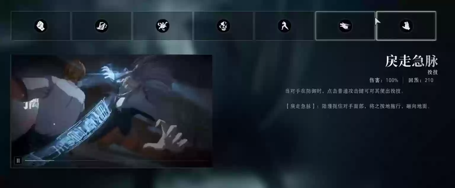 这样的技能设定其实就与已经明确了,连招都要注意打反手,防御、反击、五雷符本身就能形成循环,但是需要大家预判准确,既能减伤又能快速攒炁,而且投技戾走急脉在对手防御时点击普攻触发,技能前摇较短,可在对手释放技能硬直时衔接。投技命中后会将敌人按地拖拽,造成倒地效果,可以接投技+曲泉交忿+普攻三小连,投技仅对防御状态敌人生效,非防御状态无效而且自身僵直。