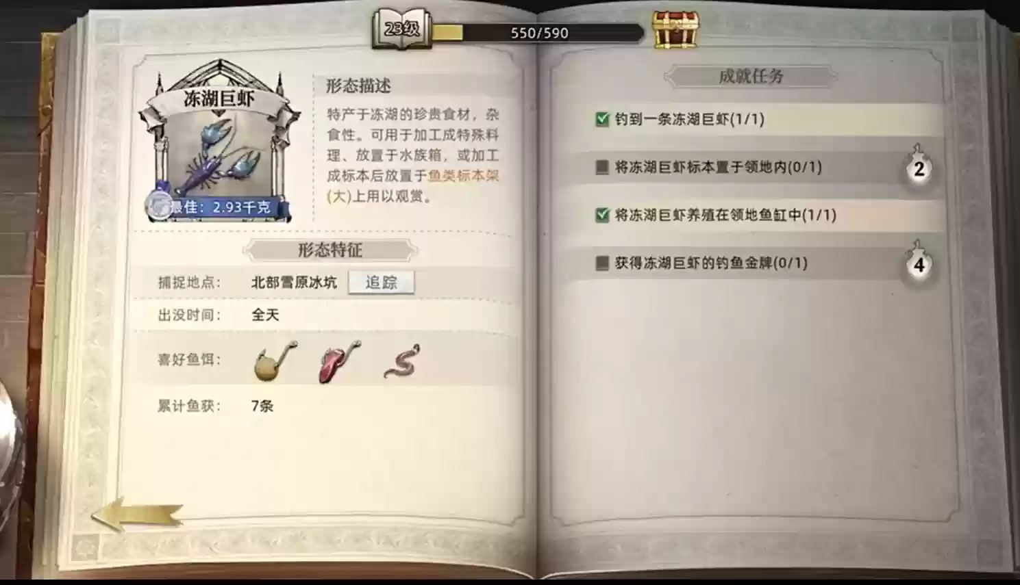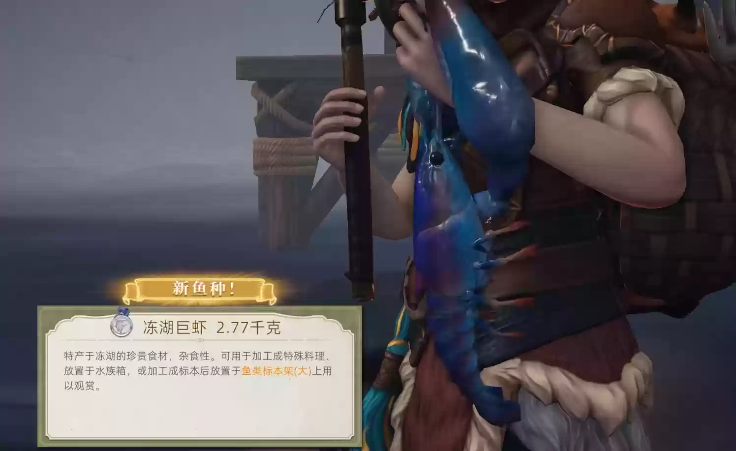 将冰坑挖出来后,各位再准备一个能持续为自己提供热源的设施,例如篝火、石制烤盘等,并把它放在离冰坑较近的位置方便自己取暖,随后就能开始进行钓鱼了。冻虾是不挑鱼饵的渔获,所以玩家可用任何一种鱼饵来掉它,且它全天都会出现,人们可随时过来钓,无需在固定时段前来。等玩家将鱼钩甩入冰坑后,冻虾会很快咬钩,玩家需及时咬杆并进行溜鱼,注意要按提示来进行操作,失误时会提高鱼线的张力导致它断掉。等鱼放弃挣扎后,各位就可将鱼竿提起来,并获取上边的渔获。