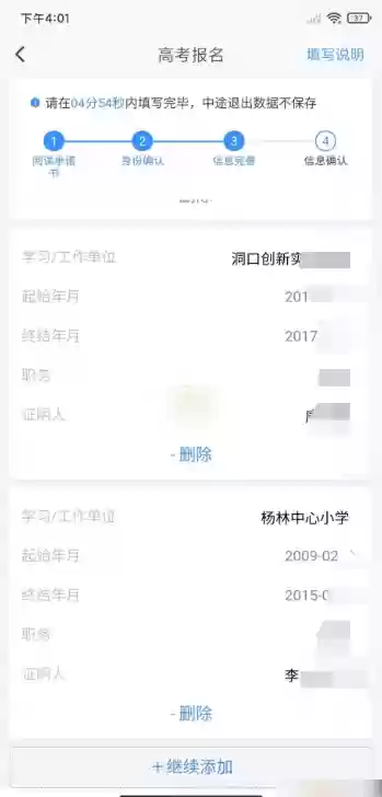 14、考生简历,填写真实有效的高中学校名称、入学时间、毕业时间、职务是学生、证明人是班主任名字(一般高中、初中、小学)顺序写