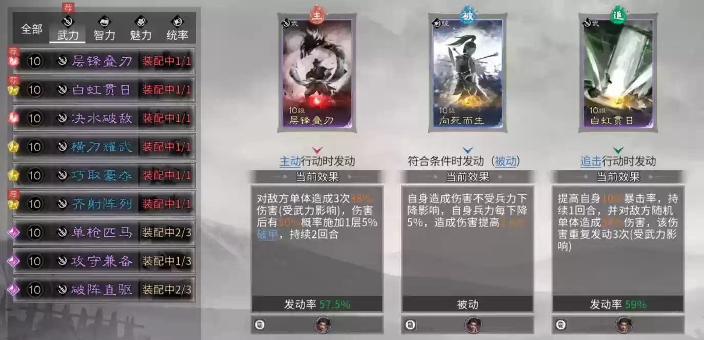 知道这里追击能够达到的最大效率之后,大家也要注意调整好武将一开始的站位,这里的话,如果对方前排挡伤害,这样的站位是最适合防御角色,那么输出安排的话,最好是在中后排治疗跟辅助的话,大家要根据他的技能范围来放,仔细看这里的武将一般在技能描述上面都会有一定的特性介绍,尤其是在这击的效果上面,大家安排这里站位的话,形成了这些攻击链之后,可以让整体的输出效率提升很多,而且要注意,目前当中同一个技能可能有主动、被动、追击等多种效果,所以在技能研究上面,大家一定要仔细一些,找到触发的机制合理发挥每一个武将的效果,才可以发挥整体最大的数值。