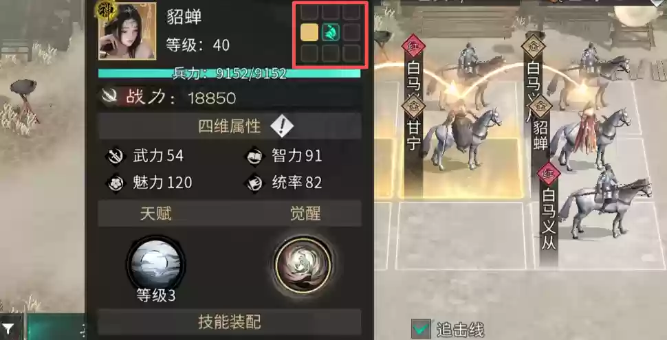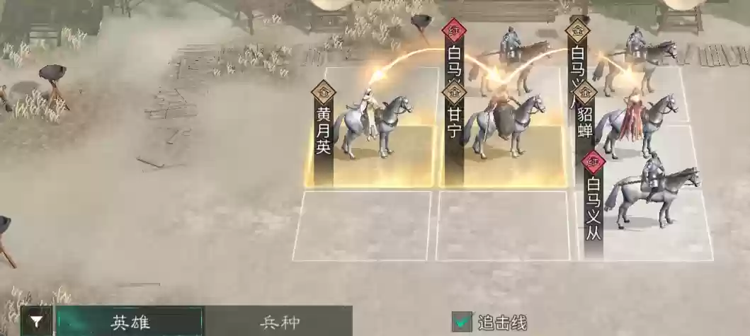 这里只要是能够触发追击这类单独行动的回合,就是武将能够带来的最强额外效果,在进行组队的时候大家会看到,游戏站位进行部署的时候每一个武将只要是绿色以上的,不管走到哪个后边都有一个小箭头,然后有一个小蓝色的标,上面标着着追字,这是什么意思呢?其实这就代表可以触发追击的意思,比如说吕布放在貂蝉的后面,就踩到了貂蝉的追击格子,那么貂蝉回合结束以后,吕布就会额外获得一个回合的行动,这个回合是貂蝉的所赠与的。