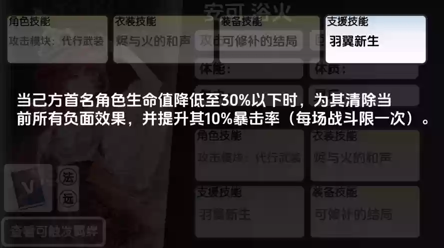 安可的装备技能叫做可修补的结局,当己方所在编队当中有角色的体能耗尽,并且导致提前离场后,此时已存在的相关联的羁绊技能还是依然生效的,而此时离场角色视为加入支援编队,这个装备效果是比较适配于安可的能力,带来的持续支援效果很明显,当然后期大家也可以根据安可需要的战场能力来进行调换,这里的装备技能一般都是挑选的。