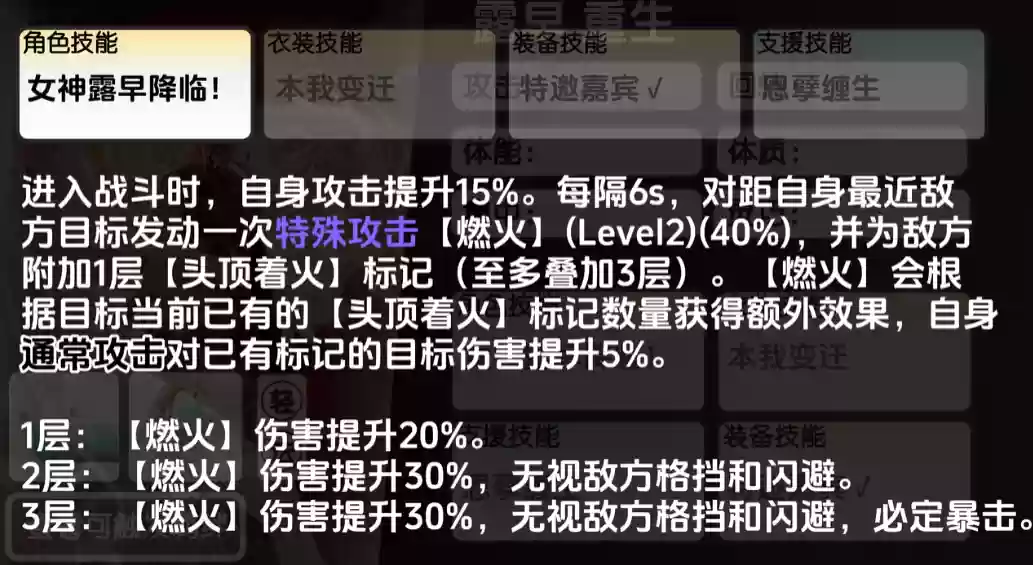 角色技能当中女神露早降临的效果最明显,一开始进入战斗时这个技能就可以用到,可以给露早带来自身攻击提升15%的效果,且同时每隔6秒的时间,都对距自身最近敌方目标发动一次特殊攻击【燃火】,并同时给敌方附加1层【头顶着火】的标记,这个标记的限制就是最多只能叠加到3层,这里带来的【燃火】效果就是会根据目标当前已有的【头顶着火】标记数量,来获得额外效果,同时自身通常攻的对已有标记的目标伤害提升5%,所以这个标记的层数越多输出就越强,【燃火】的效果是给大家的伤害提升20%的数值,一层是20%的提升,达到2层的话们就是30%的数值,且同时可以无视敌方格挡和闪避动作,最高的3层时还是30%的数值提升,但是除了在格挡和闪避的动作可以无视之外,还有一个必定暴击的加成。