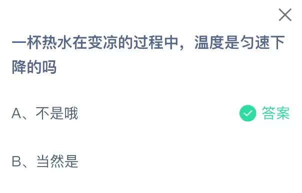 一杯热水在变凉的过程中,温度是匀速下降的吗?支付宝小鸡课堂开课啦!每天花一分钟答题赚饲料,喂喂小鸡就能贡献爱心啦!轻松又意义十足!2025年10月24日蚂蚁庄园的小鸡课堂题目正确答案是【不是哦】,一杯热水在变凉过程中,水温是先快后慢地下降。