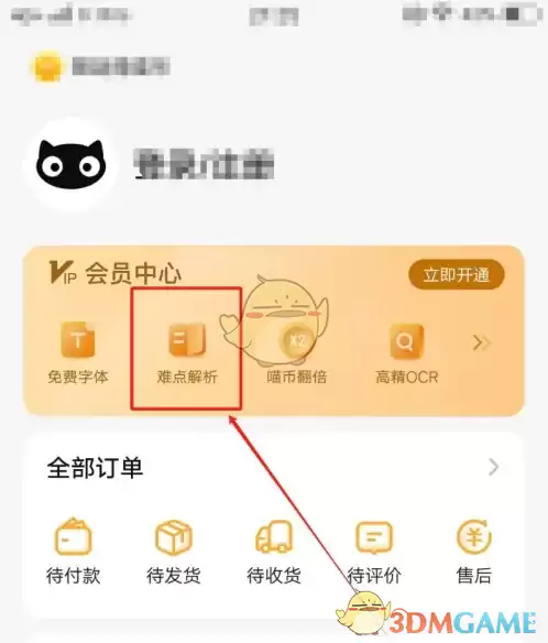 在喵喵机app中查看难点解析,可先打开应用并登录账号,进入首页后点击右下角“我的”进入个人中心,接着在个人中心页面找到并点击“难点解