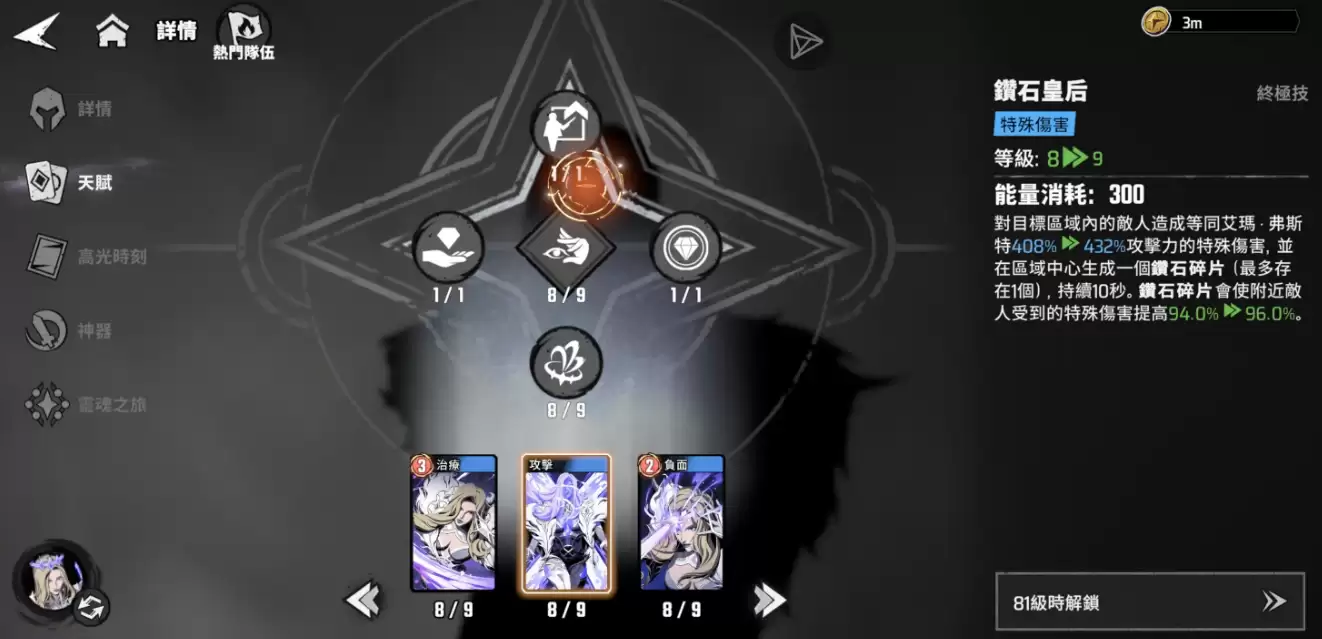 在“雷神+美队+白皇后”的经典组合中,白皇后的终极技能可增强雷神的特殊伤害类型,并削弱敌方防御属性,从而进一步放大雷神各项天赋的实际收益。与此同时,美队提供的攻防增益效果也能提升雷神的持续作战能力,使其能够在前线稳定输出,充分发挥天赋叠加的优势。