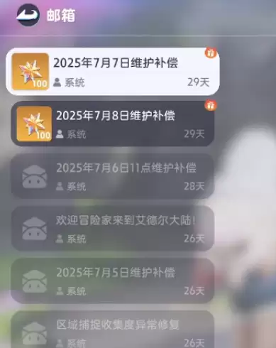 最后就是要参与游戏的开服活动,因为开服活动里面也会给到大家一些补偿以及福利,这里的话通过邮箱就可以看到目前的一些通知,因为辉石作为目前游戏当中比较用处比较多的货币,必然会出现在开发活动的补偿里面,这里给到补偿一般是在系统进行维护的时候就会给到的,而且一次性也会给很多,数量达到100~200个左右,参与此类维护的话,基本是不用大家怎么去花时间的,只要进行点击就可以拿到了。