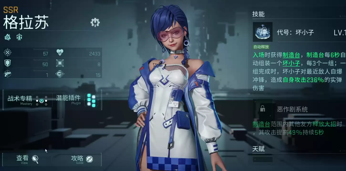 格兰芬是游戏内的工程型输出角色,同时兼备召唤组装的技能,在配备了“坏小子”机器人后,可以对最近的敌人单位造成自爆伤害,该伤害为真实伤害,且基于自身攻击倍率236%进行数值转化。