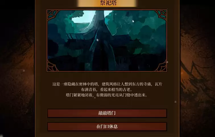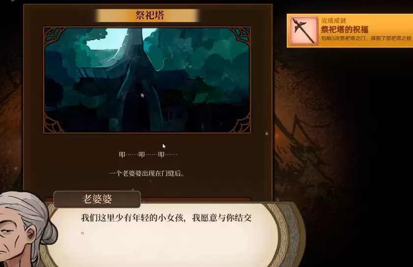 祭司塔的祝福是游戏里的一个成就,想要得到这个成就,就必须要找到祭祀塔之门,想要达成这个条件,玩家就需要去烈焰河进行探索,在这里会随机触发祭司塔,调整过程中,玩家可以多去选择带有问号的道路,在行走的过程中,如果遇到了祭司塔,那就可以直接敲门三次,达成敲门次数之后可以获得火山门之杖,这是也可以解锁祭祀他的祝福成就,获取方式是比较简单的,但祭司塔的游戏里出现的位置并不,需要多去带角色去搜索。