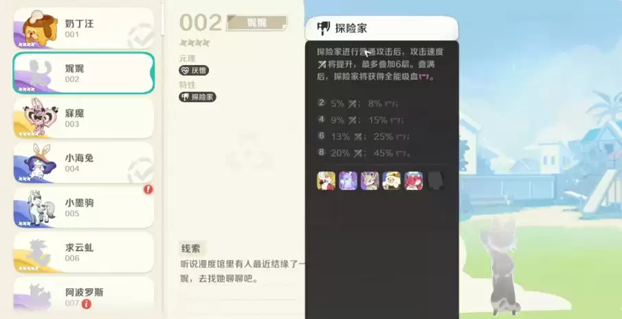 而娓娓的特性就是探险家,这类探险家角色在进行普攻之后,它本身的攻速就会有所提升,而且攻速后期可以达到6层提升的效果,在叠加满了之后,全能吸血效果对于探险家来说,带来的生存加成也足够了,那么后期在吸血的百分比上面可以达到45%的提升,所以说娓娓在攻速以及吸血能力得到足够提升之后,它的特点都是具有很大的战斗优势的,而且它自身输出以及生存能力都是可以依靠特性羁绊,以及上面的原理羁绊达到足够的加成,但是目前相对来说厌憎元理的精灵,数量还没有那么多,所以不管是元理以及特性都很难达到最高的一个羁绊数值,但是等到游戏正式开放之后,验证属性类型的精灵绝对会更多,所以后期大家进行阵容搭配的话会更自由一些。