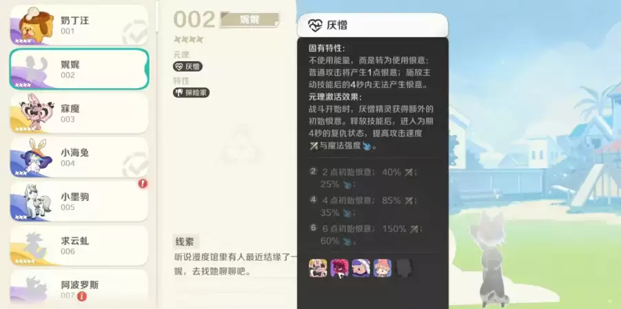 在开放世界里面,其实大家探索的时候娓娓带来的加成是非常多的,它在元理上面带来的固有特性效果是不会用到自己的能量,而是直接将这些能量转化为恨意效果,那么就算使用普攻的话,也可以产生一点的恨意恢复,这个恨意其实就相当于它的另类怒气效果了,在释放一些主动技能的时候,只要是持续4秒的时间之内,后期就都无法进行恢复了,如果是这个元理激活了之后整体的羁绊效果就会变成一开始的时候,她战斗中只要是有厌憎属性的精灵,都会额外获得一个初始恨意的数值,这个初始恨意的数值在后期是可以用来释放技能,且还可以进入到持续的复仇状态当中的。