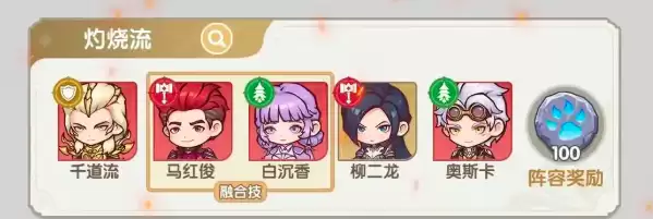 第二个流派是灼烧流,可选择千道流、马红俊、白沉香、柳二龙、奥斯卡。主c为奥斯卡,其中马红俊和白沉香能够使用出融合技能,而这一组合当中可以优先升级马红俊的凤凰啸天机与柳二龙的火龙真身,平民玩家的话,选择这个组合会有着不错的表现,真正做到低成本,高效率。
