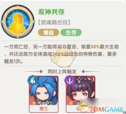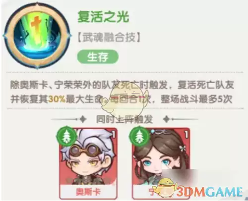 该融合技在除二人以外的队友阵亡时,会自动将其复活并恢复30%生命,每回合仅限触发一次。值得一提的是,全场最多可触发五次,属于极强的续航保障类技能,尤其适合持久战与高难度副本挑战,能有效防止因减员导致的战力崩盘。