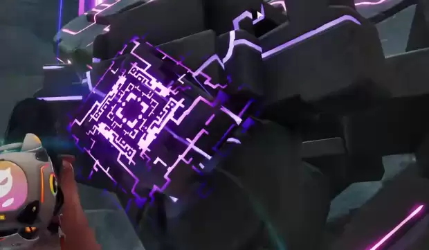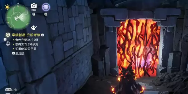 不过,大门前仍有许多荆棘阻挡入口,玩家需再次使用小炭犬的燃烧技能清障。进入后,还需完成一项能量收集任务。跟随亮起的蓝色球型能量体,即可顺利完成。