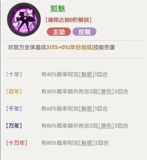 狐列娜的核心技能“狐媚”极具战略价值,不仅能对敌方全体造成技能伤害,还拥有触发魅惑和易伤双重效果的几率。当魂环强化至十万年阶段,魅惑触发概率高达80%,易伤效果的触发概率同样达到80%,且两个状态均可持续两个回合。