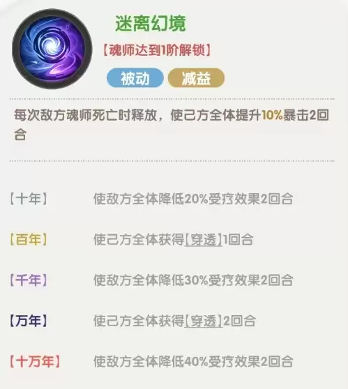 狐列娜的第一个被动效果在敌方魂师死亡时触发,能使我方全体获得暴击提升,持续两回合。此外,该效果还会额外附加降低治疗效果的属性,并赋予全体队友穿透能力。穿透效果的特别之处在于,当攻击存在护盾的目标时,可造成额外伤害且不会被护盾抵挡。这一特性对于克制治疗型魂师和前排队友都具有显著针对性。