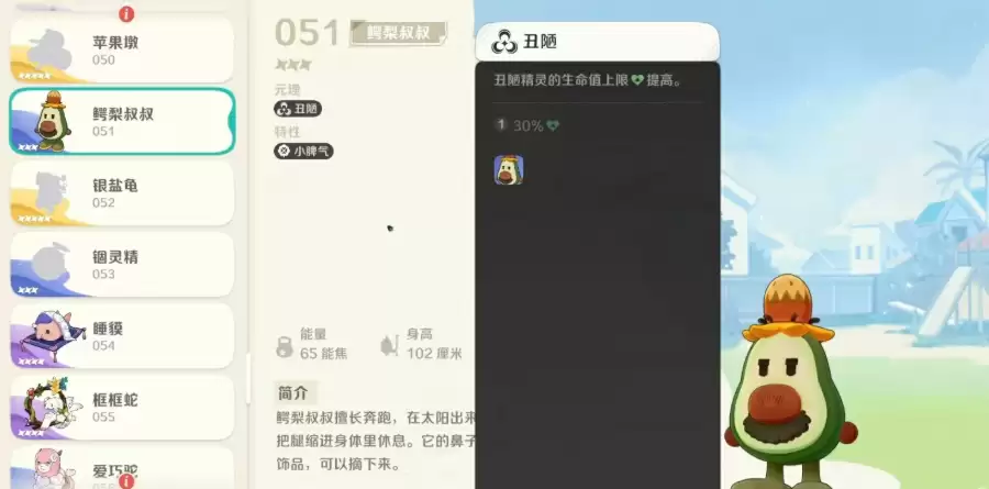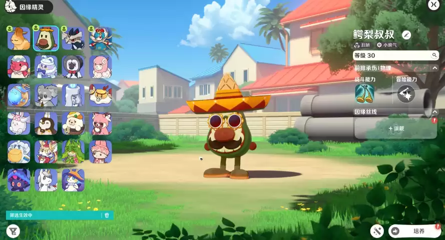 鳄梨叔叔的特性是“小脾气”。根据这个特性,玩家在选择精灵时可以有多种搭配思路。目前,小脾气类型的精灵一共有8个可供选择。