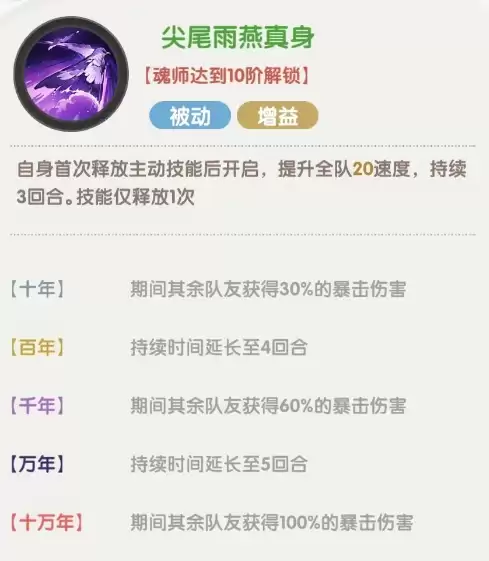 第三被动“尖尾雨燕真身”则在首次释放主动技能后激活,开启武魂真身,提升全队所有队员的速度,效果持续三个回合。值得一提的是,它同时能让队友获得暴击伤害加成,并且通过提升魂环年限,其增益的持续时间最长可延伸至五个回合。