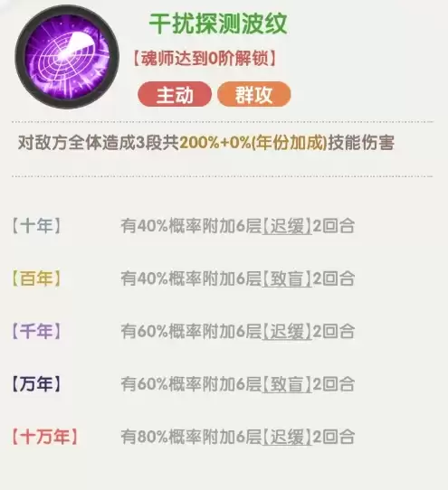 白沉香的核心战力体现在其主动技能上。该技能可对敌方全体造成多段伤害,升阶后更有概率附加延迟与致盲两种负面状态。目标被延迟后会显著降低闪避能力,而被致盲则减少命中率,这使得她在实战中成为极具战略价值的控制型魂师。