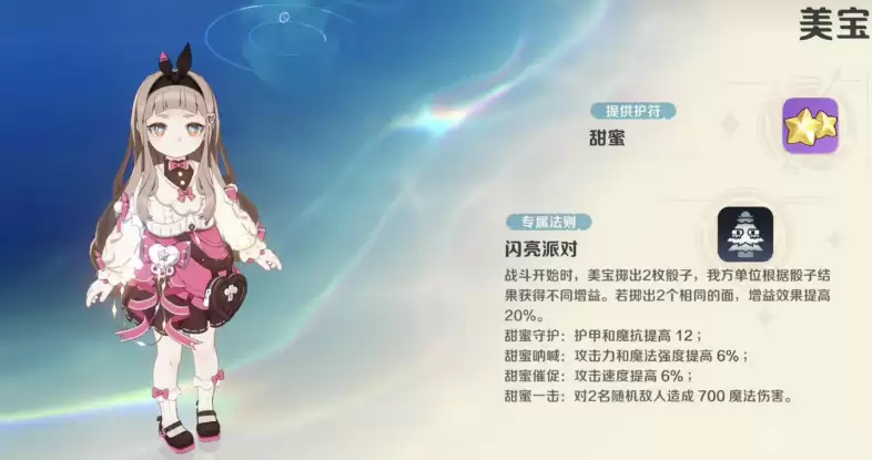 美宝以其甜美的气质吸引了大量玩家的关注。她不仅外形可爱,头戴的黑色蝴蝶结更增添了几分少女气息。在基础属性方面,美宝拥有较高的亲和力,能够为队伍带来显著的实战提升效果。值得注意的是,她的核心技能具备一个独特的“闪亮派对”效果,该效果在战斗开始时会自动触发。