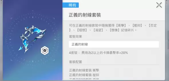 如果您更多使用两费以上的高费卡牌,那“正义的射线”套装将是不错的选择。它带来20%的暴击率加成,使高费技能在爆发时更加稳定。此外,还有针对不同属性和战斗风格的套装,例如“秩序之弹匣”与“虚无之禁品”。后者能有效强化虚无属性输出,在针对特定敌人时表现出色。