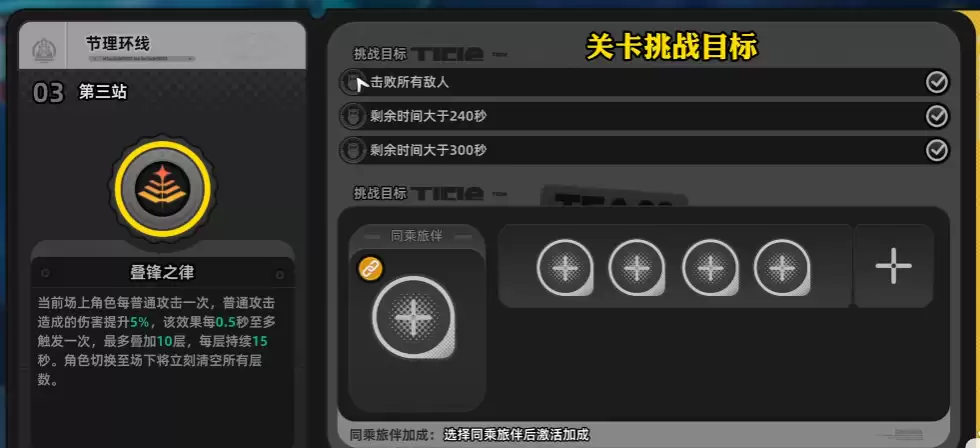 需要注意的是,玩家需密切关注关卡界面左下角的提示信息,此处会显示当前关卡特有的机制加成效果。由于不同关卡规则各异,务必提前熟悉。此外,"同乘旅伴"功能允许玩家选择一名角色加入队伍,为团队提供额外增益效果。