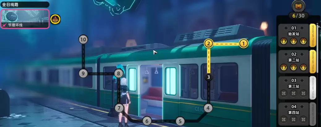 在轨外之境模式中,玩家需要驾驶电车依次通过10个站点,相当于10个独立关卡。每成功完成一关并达成完美条件,即可获得3枚猫头鹰徽章以及对应关卡的专属奖励。每个关卡设有特定目标,例如第3关要求同时满足击败全部敌人、剩余时间超过240秒及300秒三项标准,唯有全部达标方可领取全部3枚徽章。