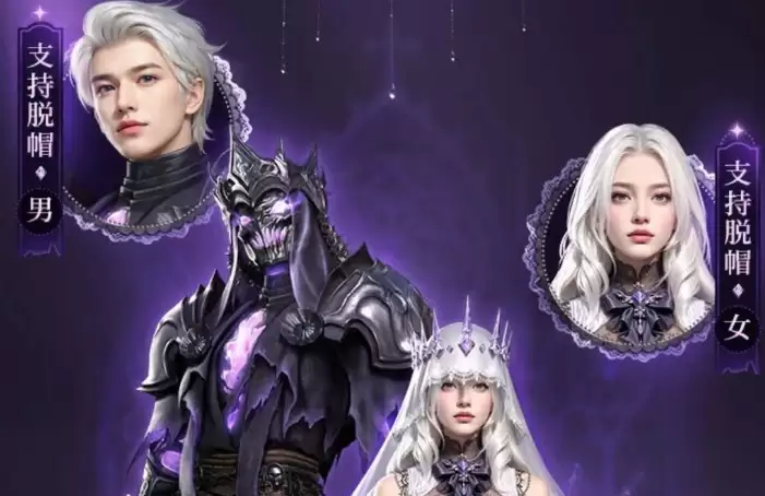 此套时装以宗教幻想为设计灵感,呈现出神圣而又诡谲的气质。女性角色身披洁白长裙,搭配剔透的冰晶王冠与轻盈头纱,袖口点缀精致蕾丝,幽火装饰更增添几分神秘气息。男性角色则身披银色护甲,胸口燃起紫色烈焰,头戴荆棘王冠造型,尽显审判使者的威严气场。