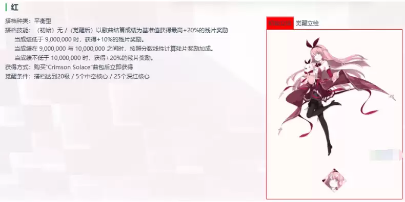 大家购入了相应曲包之后,可以直接获取红,这个角色一般情况下,大家可以在世界末日的第二章里面拿到,那么后期她如果在搭档形态等级达到20级的时候,也可以使用中控核心跟深红核心这两个材料把她唤醒,这里一般情况下,大家奖励残片奖励的数值基本都是10%的数值,那么她作为提高奖励效果的话,达到了20%的性价比还是非常高的,而且如果大家分数是在900万到1000万之间的时候,则是按照分数,大家可以根据相应的百分比达到不同的线性奖励加成,比如说如果其中大家得到的是98万分的话,那么此时会有18%的奖励加成,所以大家也看成她技能生效是有一个提升区间的,并不是一开始就是20%的提升数值。