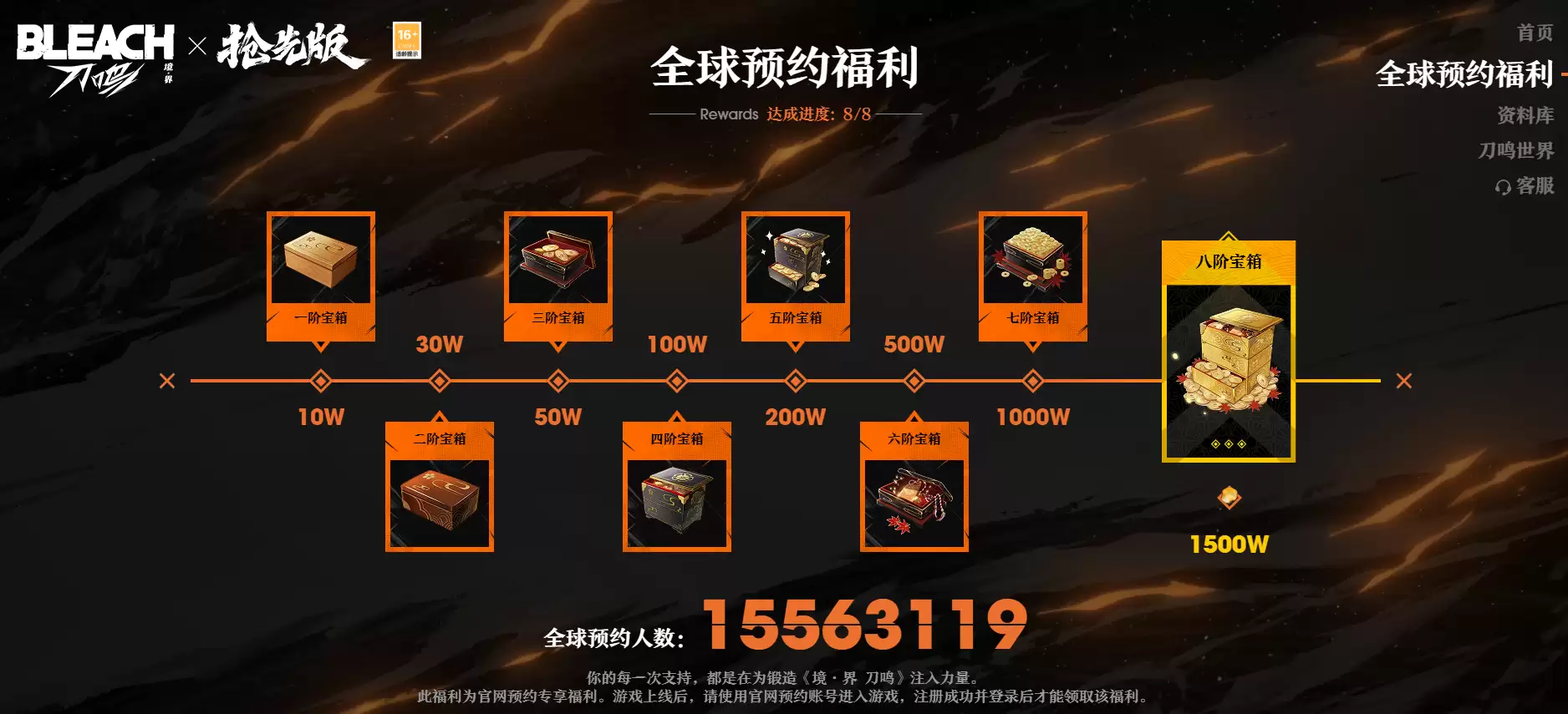 全球预约人数突破1000万!《境·界 刀鸣》特别追加第八档预约福利,静待各位死神代理人解锁——达成1500万预约,全员赠送:「召集令*10 及 纪念头像框」!现在即刻前往预约《境·界 刀鸣》,就能获得SR角色集结邀请函、稀有核心刻印、神秘预约礼盒等超值好礼!