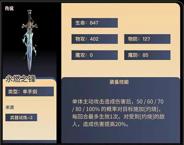 永燃之锋是游戏中极具代表性的火焰属性武器,不仅外观燃烧着不灭的火焰,还附有持续伤害效果,适合偏向进攻型打法的玩家使用。
