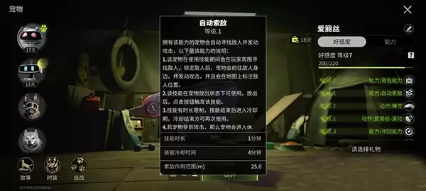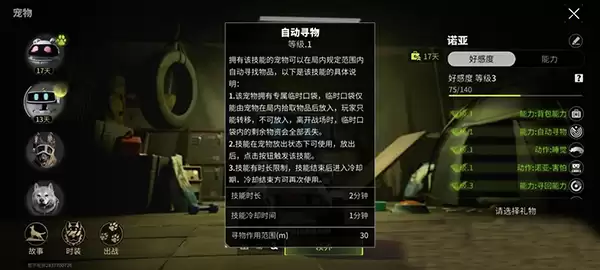 一级的诺亚就拥有自动寻物的技能,点击后诺亚会在指定区域帮萤火虫自动收集物资。诺亚拥有一个临时空间来存放他收集到的物资,临时空间需要单独升级。在收集的过程中,诺亚会被攻击,也会被打死,打死后临时空间内的东西会掉落,但是保险内的并不会。特别注意的是,临时空间内的物品在撤离时不会一起带出,而是会留在原地,所以撤离前一定要仔细检查。