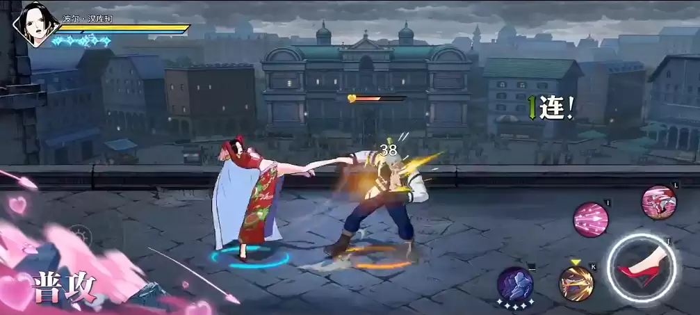 《航海王:壮志雄心》中的波尔汉库珂,其普通攻击体系设计颇为精妙,共分为五段。起手两段是迅捷的连环踢击,用以快速贴近敌人;第三段将释放其标志性的远程技能“吻枪”,造成可观的中距离突进伤害;随后衔接的三段强化踢技,能将目标击飞并进行重踏压制,有效控制战场节奏。