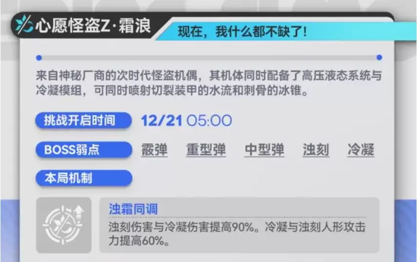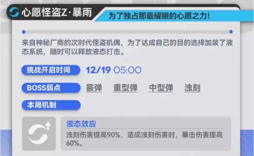 首先登场的是“心愿怪盗Z·熔岩”。他源自某神秘厂商,是次时代怪盗机甲,胸臆中燃烧着不屈的烈焰。这个BOSS的弱点属性为霰弹、重型弹、中型弹以及燃烧。在本关卡的特殊机制下,燃烧伤害提升90%。此外,当对目标造成燃烧伤害时,暴击伤害会同步提升60%,这要求队伍必须善用火属性攻击来获得巨大优势。