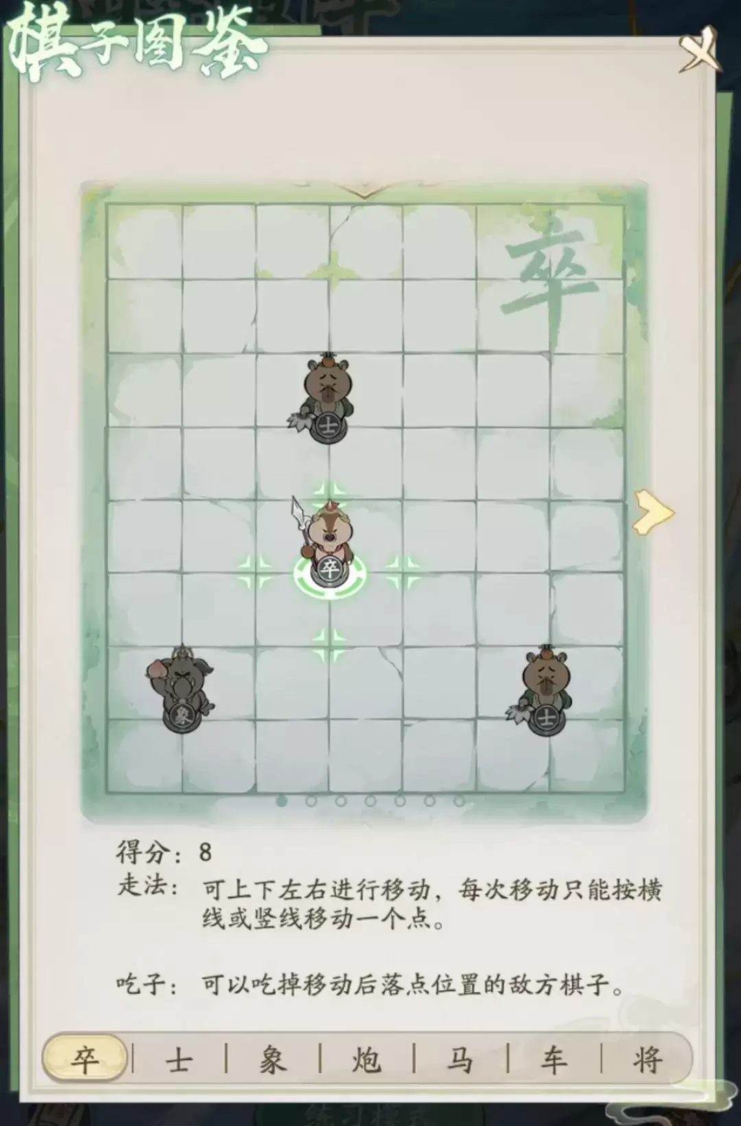 此外,每个棋子的移动和“吃子”规则各不相同,例如“卒”可以吃掉移动后落点位置的敌方棋子。更完整的规则,建议您直接在游戏内的“棋子手册”中查看,以便精通每种棋子的特性,制定更优的仙弈破阵策略。