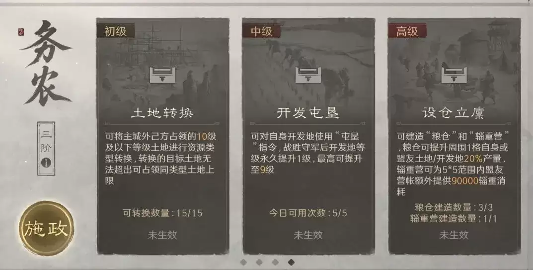 开荒阶段推荐优先启用“务农”方略。第一阶段可对城外土地实施类型转换,建议结合资源克制关系择优攻占,再执行转换操作;石料资源因产出效率与建设需求匹配度高,应列为首选转换目标。第二阶段可集中资源将8级开发土地升级至9级,此为提升初期资源产能的关键路径。