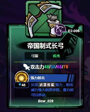 这才是重火力爱好者的终极梦想。高达48点的初始攻击力,足以在早期就建立起压倒性的优势。其“强力射击”技能支持蓄力机制,当你按住技能键时,弓弦上会凝聚金色的力量,松开瞬间,便可射出贯穿力极强的箭矢。这赋予了它强大的战术价值,能够直接穿透前排的敌人,攻击到躲在后方的法师或支援单位。在面对城堡中的巨型Boss时,这把弓也能让你保持在安全的距离外,打出爆发性的伤害。