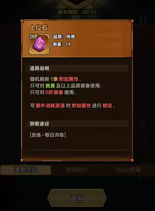 挑战成功后,玩家可以立即获得掉落的“上位石”和“下位石”,并直接在装备洗练界面使用。一个关键要点是,最终奖励的多少仅与是否成功击败Boss相关,与战斗耗时长短无关。只要在5分钟内完成挑战,即可领取全额奖励。