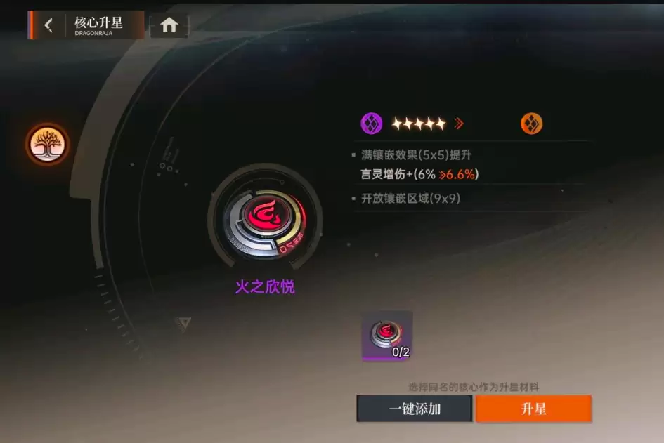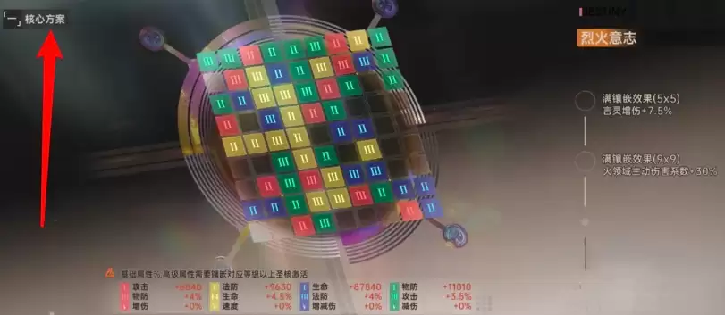 当5x5圣核网格全部嵌入有效圣核后,系统将自动触发升级流程,开启9x9圣核界面。此时,你需要更换为更高阶的橙色圣核进行填充。推荐优先选用适配性广的“火之你欣悦”、“烈焰意志”等类型,其属性加成能匹配多数输出型英雄的配置需求。虽然游戏支持“一键镶嵌”功能快速铺满格位,但为确保战力最大化,建议根据当前主力阵容特性,手动筛选匹配度更高的圣核类型进行部署。