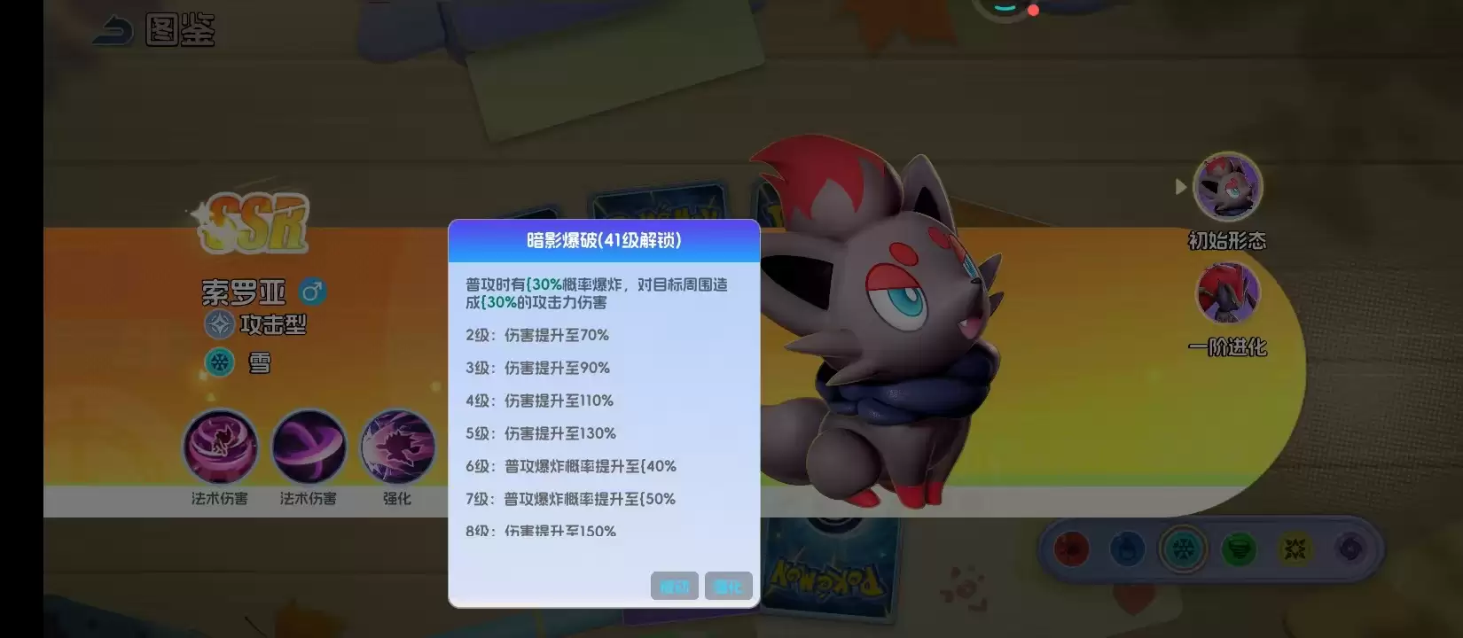 作为攻击型宝可梦,索罗亚的核心优势在于出色的控场能力和高爆发输出。其招牌技能"无尽暗夜"能对密集的敌方区域造成770%的攻击力伤害,在清除目标护盾后,还能附加三秒的定身效果。这一技能不仅是清场利器,更能直接打断敌方关键技能的释放,为我方创造更佳的输出窗口。