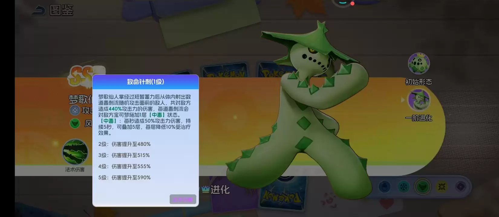 完成一阶进化后,刺球仙人掌将蜕变为梦歌仙人掌。此时其战术体系更加完善,核心战术围绕持续性伤害与中毒效果展开。致命针刺技能的实用性尤为突出:梦歌仙人掌在短暂蓄力后,会从体内射出无数道毒刺流,对前方敌人造成590%攻击力伤害。每道毒刺流均会使敌方宝可梦陷入中毒状态,该状态每秒造成50%攻击力持续伤害。